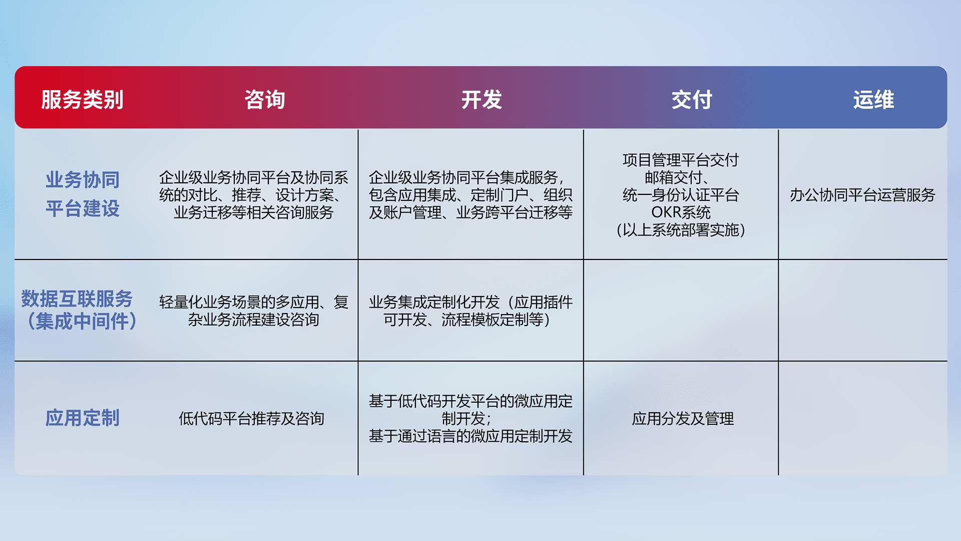 针对钉钉、、、企微、、IDaas等平台级产品提供产品的规划、、、方案、、、、交付、、定制化开发等服务,,,实现如统一协同办公、、、智能客户服务、、混合会议管理、、智能数据查询、、、、等业务场景,,,,实现数字化转型。。。